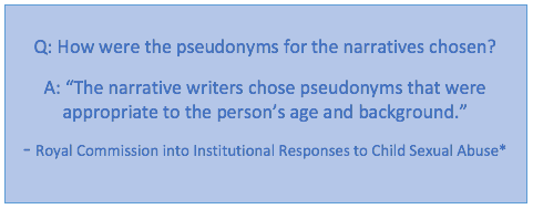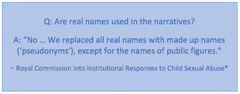 “If you have agreed to it, the Royal Commission may also use some of your information in its reports. Your information will be ‘de-identified’, which means that your identity (and any other information that could reveal your identity) will not be published in our reports.” – ‘After sharing your story’. As published in the Final Report Volume 5 Private sessions, pp. 333-343.