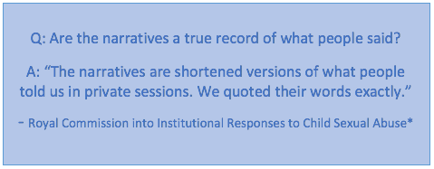 The preamble to the 44 narratives on SaySorry.org accurately states: “All stories are from the Australian Royal Commission into Institutional Responses to Child Sexual Abuse: Final Report.”