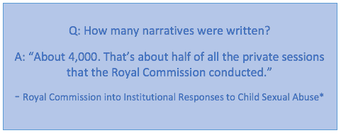 *Narrative questions and answers provided by the Royal Commission into Institutional Responses to Child Sexual Abuse and are extracted from the brochure ‘Narratives frequently asked questions‘. © Commonwealth of Australia. 2017. Used under licence.