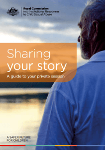 The Sharing your story booklet also informed those who registered for a private session that they will receive a phone call to determine the best suitable time and location for their private session. Those who still desired to share their story with the Child Abuse Royal Commission were then sent a confirmation of private session letter from a Private Sessions Coordinator.