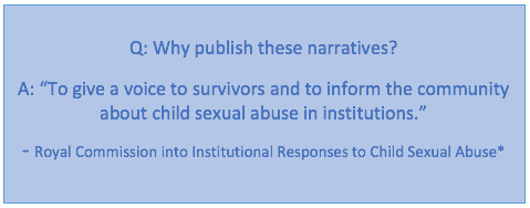 “We also decided to publish, with their consent, as many individual survivors’ experiences as possible, as de-identified narratives drawn from private sessions and written accounts. These narratives are presented as accounts of events as told by survivors of child sexual abuse in institutions. We hope that by sharing them with the public they will contribute to a better understanding of the profound impact of child sexual abuse and may help to make our institutions as safe as possible for children in the future. The narratives are available as an online appendix to Volume 5, Private sessions.” – Final Report Volume 5 Private sessions, p. 2.