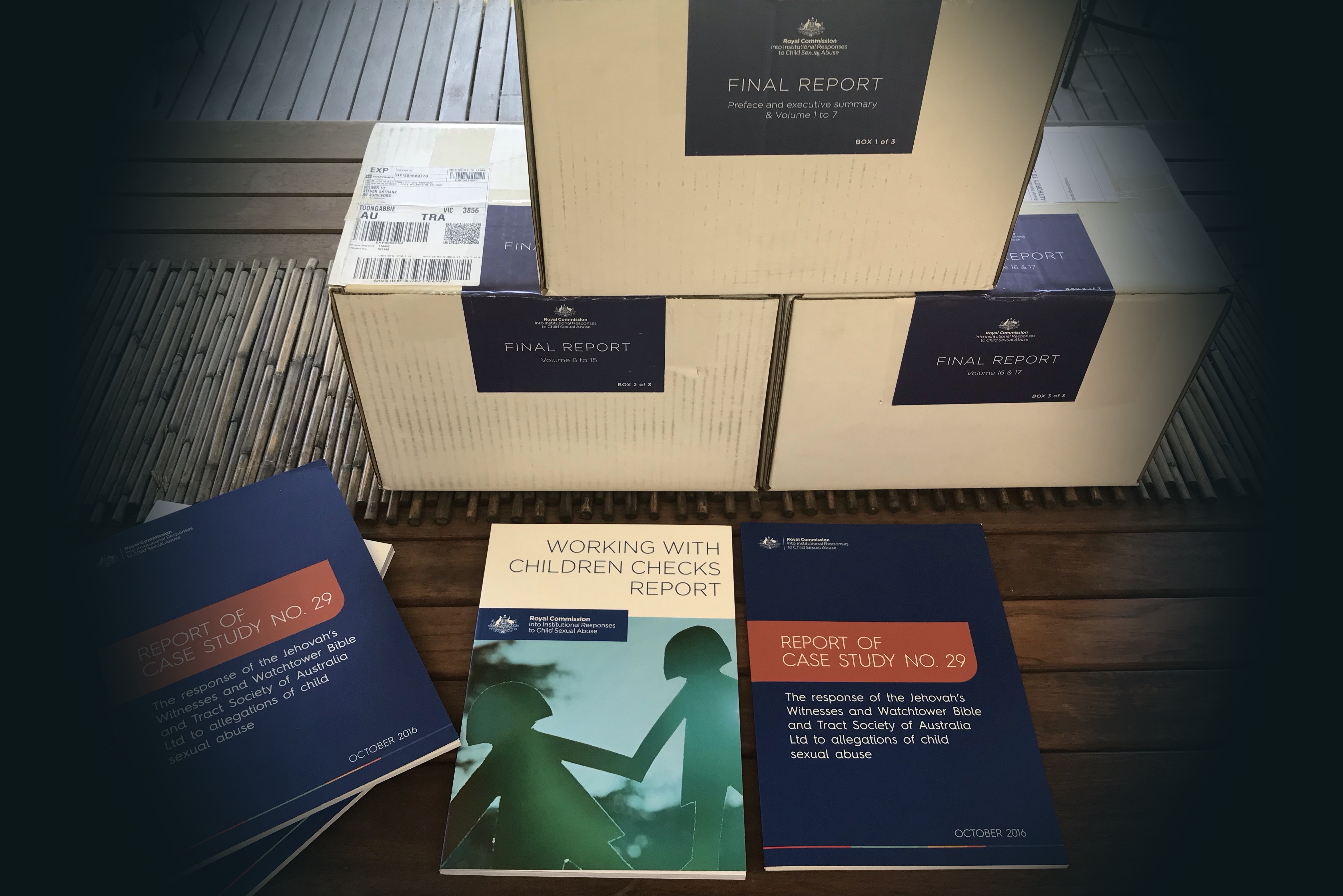 A complete printed version of the Final Report (in boxes) and Case Study 29 into Jehovah’s Witnesses, Royal Commission into Institutional Responses to Child Sexual Abuse. As delivered to Say Sorry. Image by Say Sorry. 2018.Copyright notice