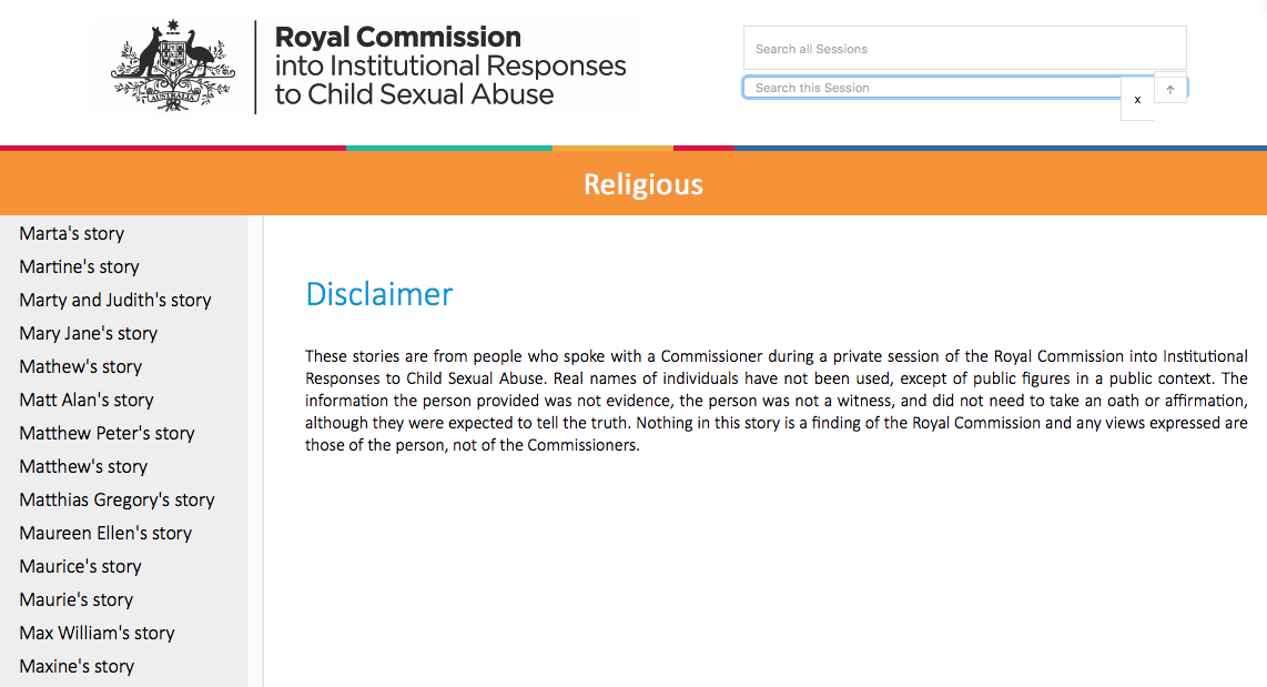 “These stories are from people who spoke with a Commissioner during a private session of the Royal Commission into Institutional Responses to Child Sexual Abuse. Real names of individuals have not been used, except of public figures in a public context. The information the person provided was not evidence, the person was not a witness, and did not need to take an oath or affirmation, although they were expected to tell the truth. Nothing in this story is a finding of the Royal Commission and any views expressed are those of the person, not of the Commissioners.” – Final Report, Private session narratives, USB searchable database. 2017.