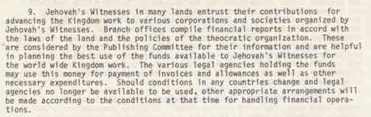 Between 1977-1999 the New Zealand Branch Office was provided with a Watch Tower Society corporate manual entitled Branch Organization. As an example, this manual, in explaining the legal financial responsibilities of the branch, stated on page 1-2: