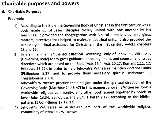The CCJWA’s constitution clearly states that the companies objects are specifically to “promote throughout Australasia the advancement of the Christian religion as understood and taught by the Governing Body” of Jehovah’s Witnesses . . . and that CCJW(A) is the conduit for the spiritual, ecclesiastical, and corporate direction of the Governing Body of Jehovah’s Witnesses and NOT the Branch Committee of the Australasia Branch Office of Jehovah’s Witnesses as claimed – and of which claim if true would place the branch committee members above the governing body of Jehovah’s Witnesses in the hierarchy of the religion, a circumstance which would be demonstrably false.