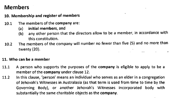 As mentioned earlier, but worth repeating in this context, CCJWA is limited by clause 10.2 of its Constitution to “no fewer than five (5) and no more than twenty (20)” members, including both natural persons and incorporated bodies operating under the direction of the Governing Body of Jehovah’s Witnesses.