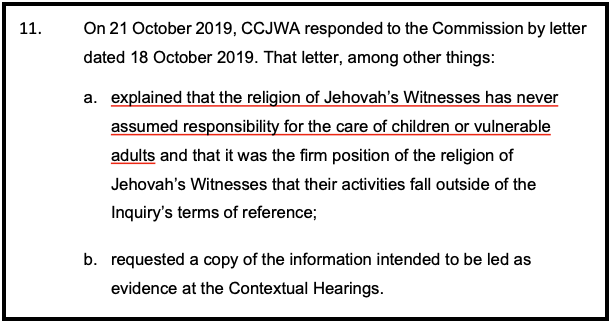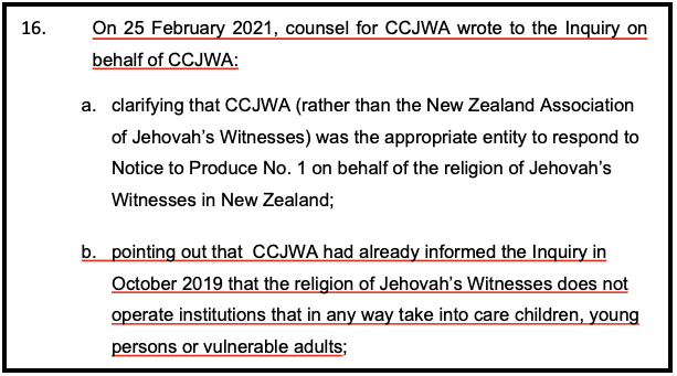 In a letter dated 18 October 2019 CCJWA explained to the New Zealand Abuse in Care Royal Commission of Inquiry that “the religion of Jehovah’s Witnesses has never assumed responsibility for the care of children or vulnerable adults.”