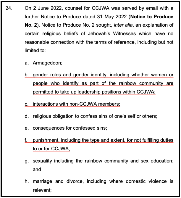 On 13 June 2022 counsel for CCJWA issued a letter to the Commission voicing concern in relation to Notice to Produce No. 2. The letter also expressed concerns that Notice to Produce No. 2 went well beyond the terms of reference and risked infringing Jehovah’s Witnesses right to freedom of religion (which in any event are questions of law).