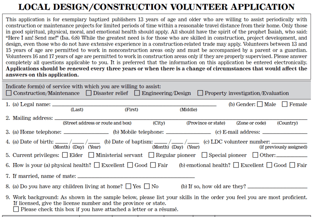 Below is a screenshot of a typical Volunteer Application form that has from time-to-time been used by the Jehovah’s Witnesses institution. In reading the document it is worth keeping in mind that it is disingenuous for the Jehovah’s Witnesses institution to claim that child volunteer construction workers are not under the control, supervision, or authority of the builder or Person Conducting Business Undertaking (PCBU).