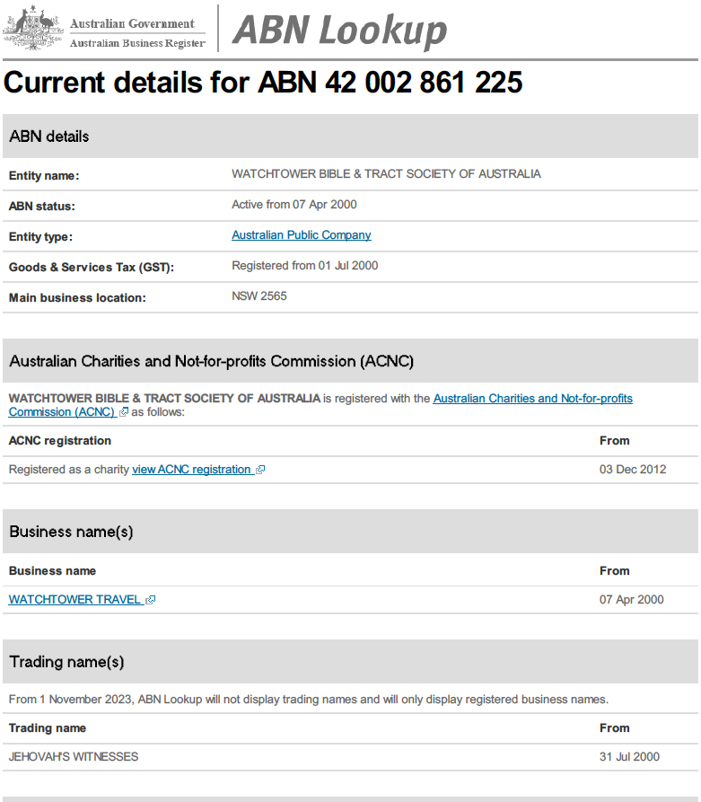 To add further potential confusion, Watchtower Bible and Tract Society of Australia Limited is registered in Australia as trading in Australia under the trading name “Jehovah’s Witnesses” from 31 July 2000 onwards.