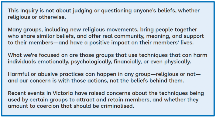 The Inquiry, is looking into coercive control and ‘cult’ like behaviour within cults and new religious movements within Victoria, Australia. Recommendations from the Inquiry will be delivered to parliament in September 2026.